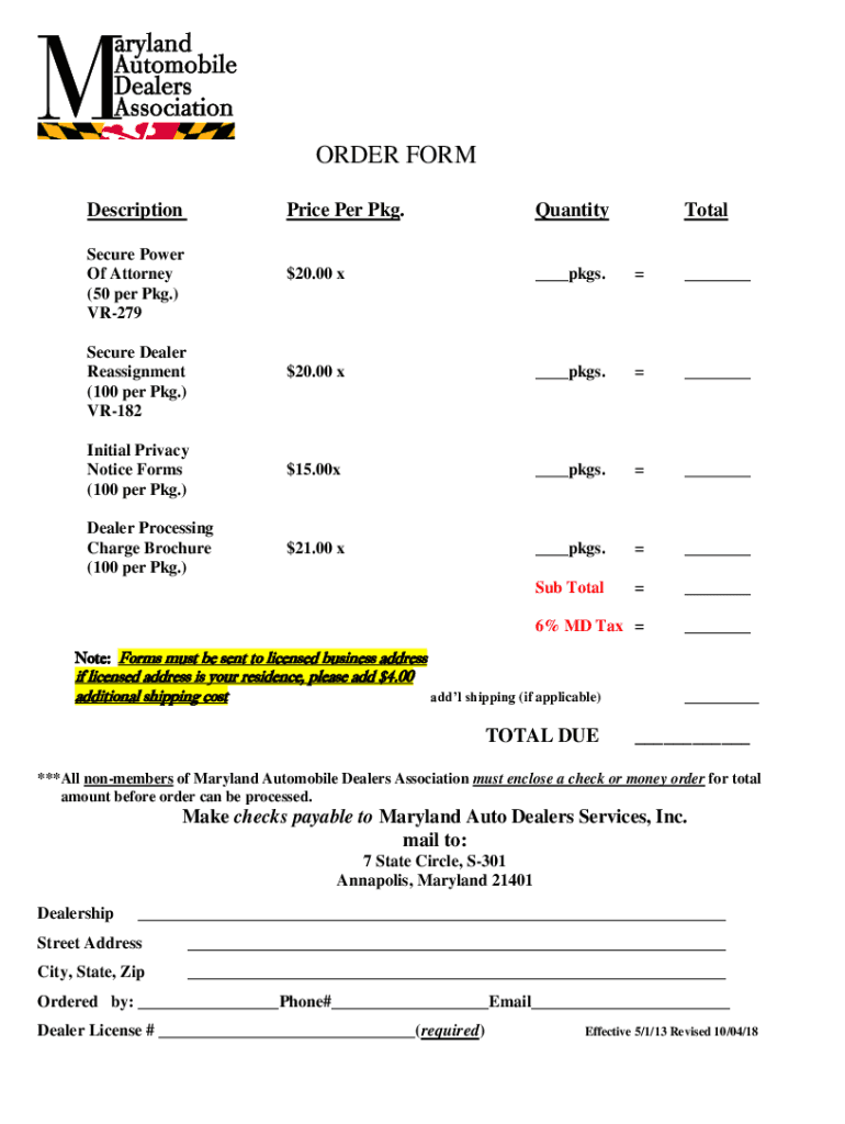 ORDER FORM Description Price Per Pkg. Quantity$20.00 x PKGs. $20.00 x PKGs. Initial Privacy Notice Forms (100 per Pkg.)$15.00x PKGs. Dealer Processing Charge Brochure (100 per Pkg.)$21.00 x PKGs.