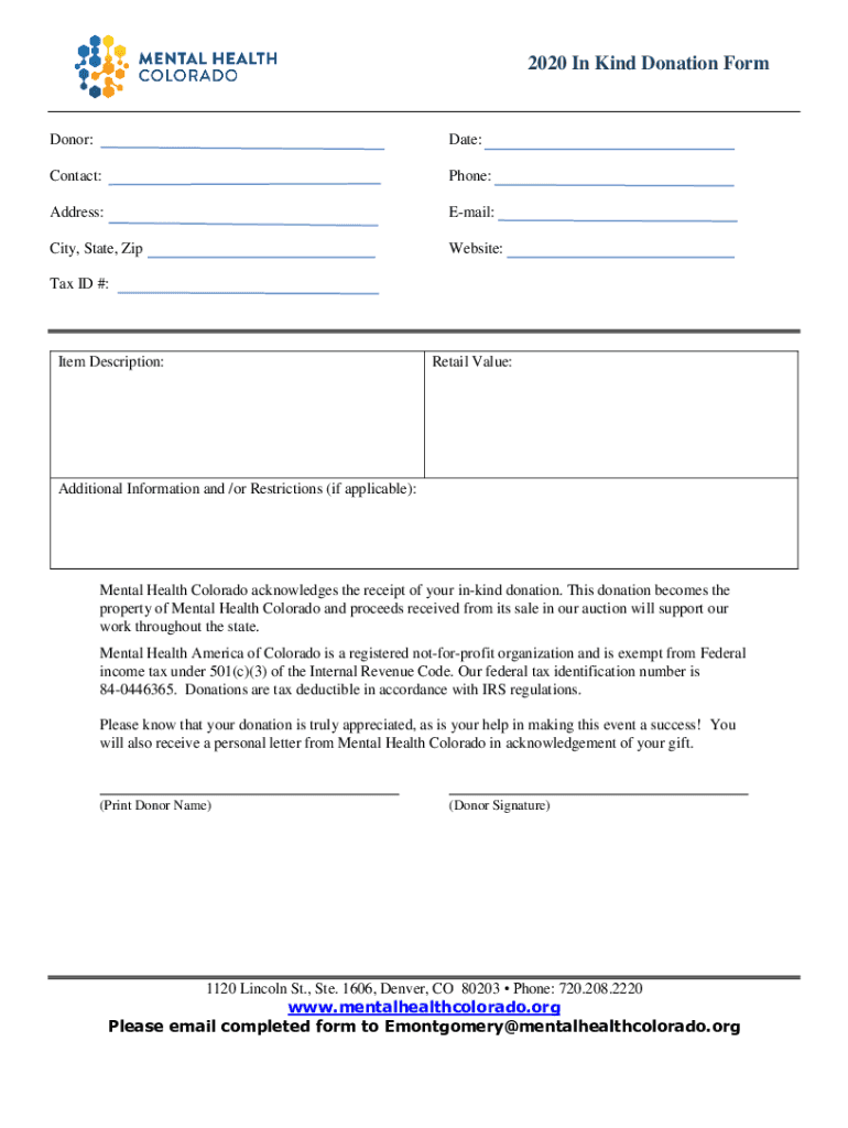 2020 In Kind Donation Foredoom:Date:Contact:Phone:Address:Email:City, State, Website:Tax ID #:Item Description:Retail Value:Additional Information and /or Restrictions (if applicable):Mental Health