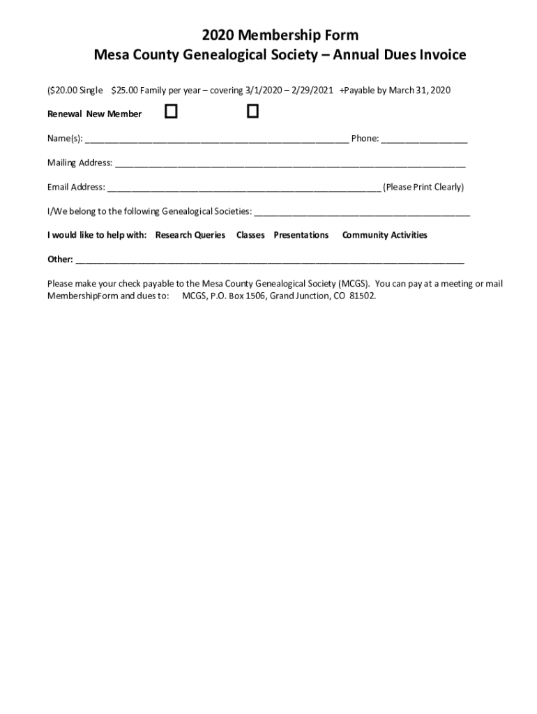 2020 Membership Form Mesa County Genealogical Society Annual Dues Invoice ($20.00 Single $25.00 Family per year covering 3/1/2020 2/29/2021 +Payable by March 31, 2020, Renewal New Member Name(s):