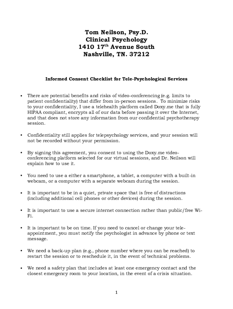 Nashville, TN. 37212Informed Consent Checklist for TelePsychological Services