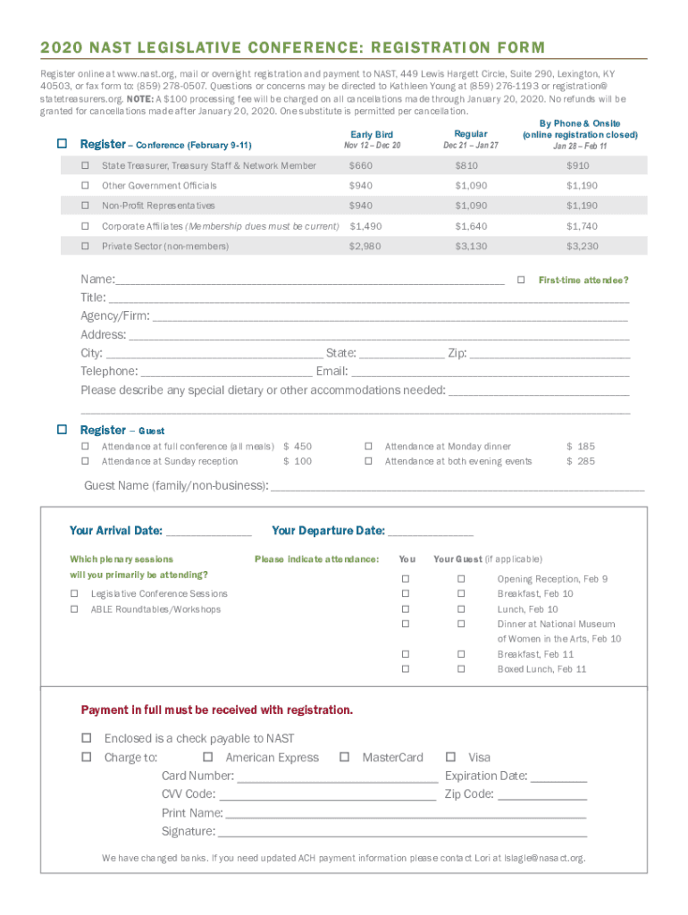 2020 N AS T L E G IS L AT IV E C ON FER EN CE: R EGGS TR ACTION FOR M Register online at www.nast.org, mail or overnight registration and payment to LAST, 449 Lewis Largest Circle, Suite 290, Lexington,