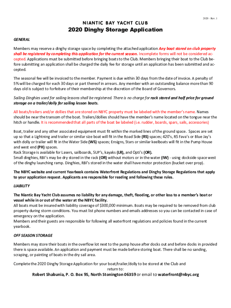 2020 Rev. 1NIANTIC BAY YACHT CLUB2020 Dinghy Storage Application GENERAL Members may reserve a dinghy storage space by completing the attached application Any boat stored on club property shall be