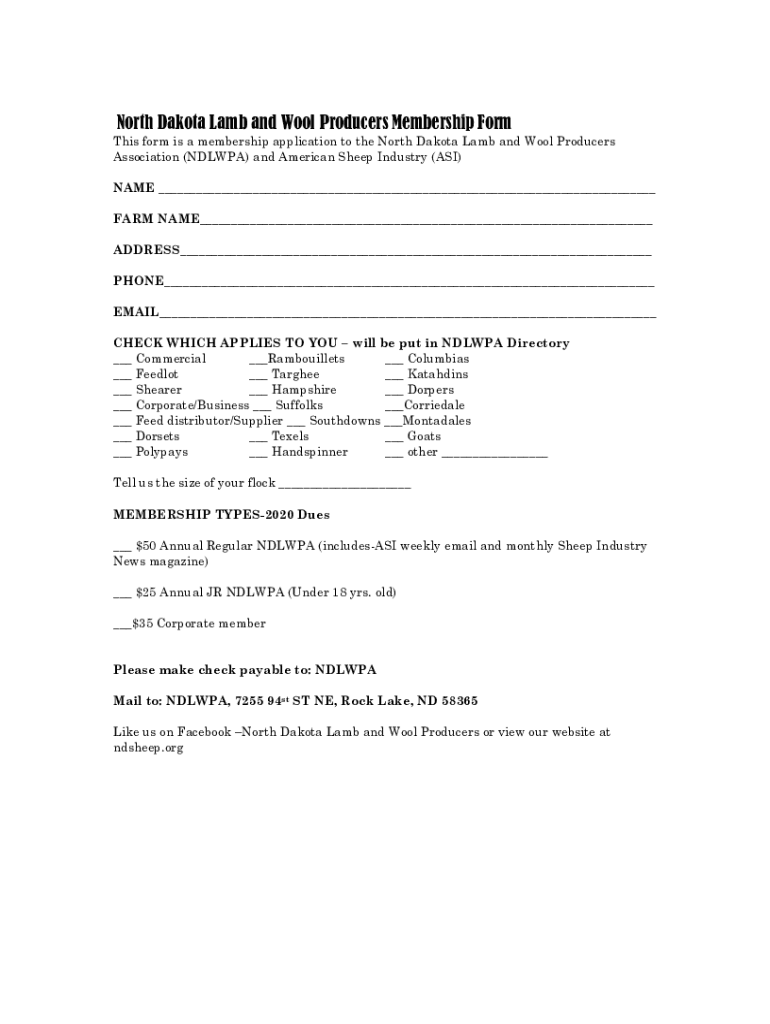 North Dakota Lamb and Wool Producers Membership Form This form is a membership application to the North Dakota Lamb and Wool Producers Association (NDLA) and American Sheep Industry (AS) NAME FARM