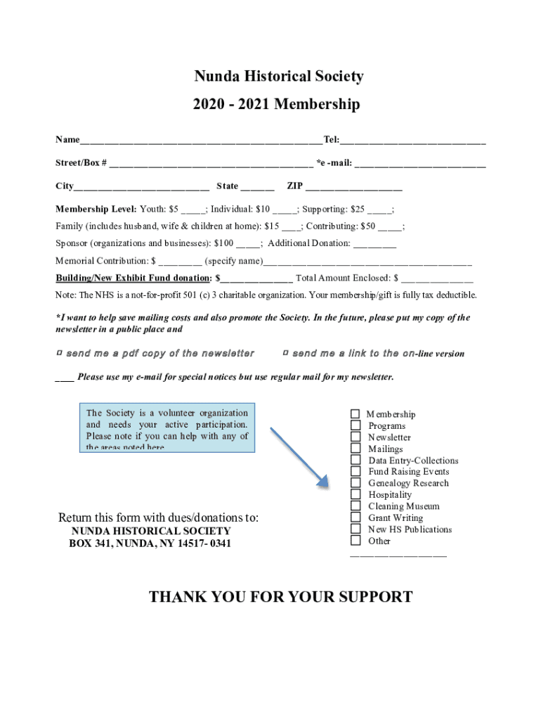 Volume 3 Issue 2Nunda Historical Society 2020 2021 MembershipName Tel: Street/Box # *e-mail: City State ZIP Membership Level: Youth: $5 ; Individual: $10 ; Supporting: $25 ; Family (includes husband,