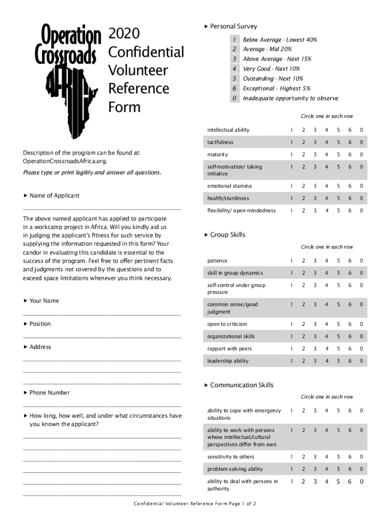 2020 Confidential Volunteer Reference Form Description of the program can be found at: OperationCrossroadsAfrica.org. Please type or print legibly and answer all questions. Name of Applicant The above