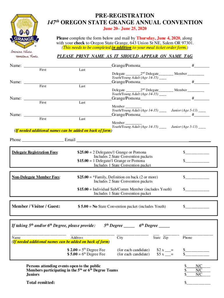 PREREGISTRATION 147 OREGON STATE GRANGE ANNUAL CONVENTION June 20 June 25, 2020, Please complete the form below and mail by Thursday, June 4, 2020, along with your check to Oregon State Grange, 643