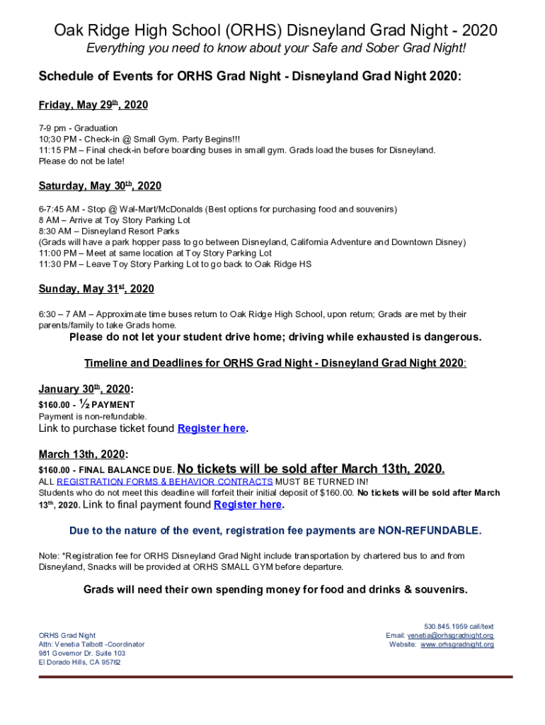 Oak Ridge High School (ORES) Disneyland Grad Night 2020 Everything you need to know about your Safe and Sober Grad Night! Schedule of Events for ORES Grad Night Disneyland Grad Night 2020: Friday,