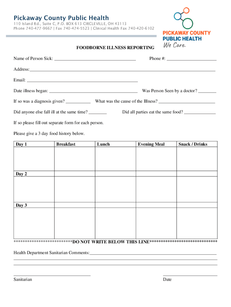 Pick away County Public Health110 Island Rd., Suite C, P.O. BOX 613 NICEVILLE, OH 43113 Phone 7404779667 Fax 7404745523 Clinical Health Fax 7404206102FOODBORNE ILLNESS REPORTING Name of Person Sick: