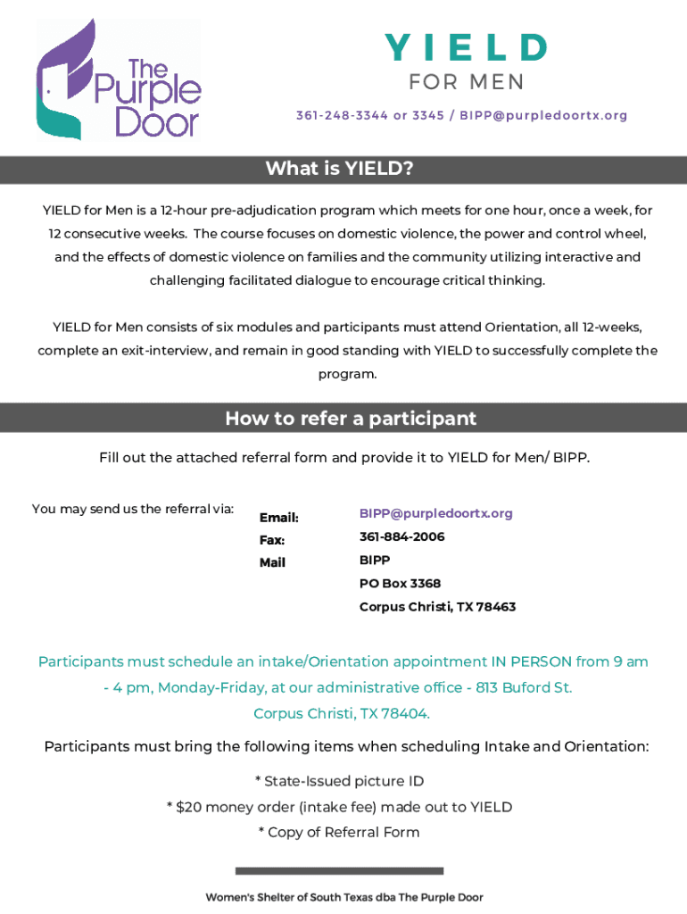 YIELD FOR MEN3612483344 or 3345 /IPP purpledoortx. What is YIELD? YIELD for Men is a 12hour adjudication program which meets for one hour, once a week, for 12 consecutive weeks. The course focuses