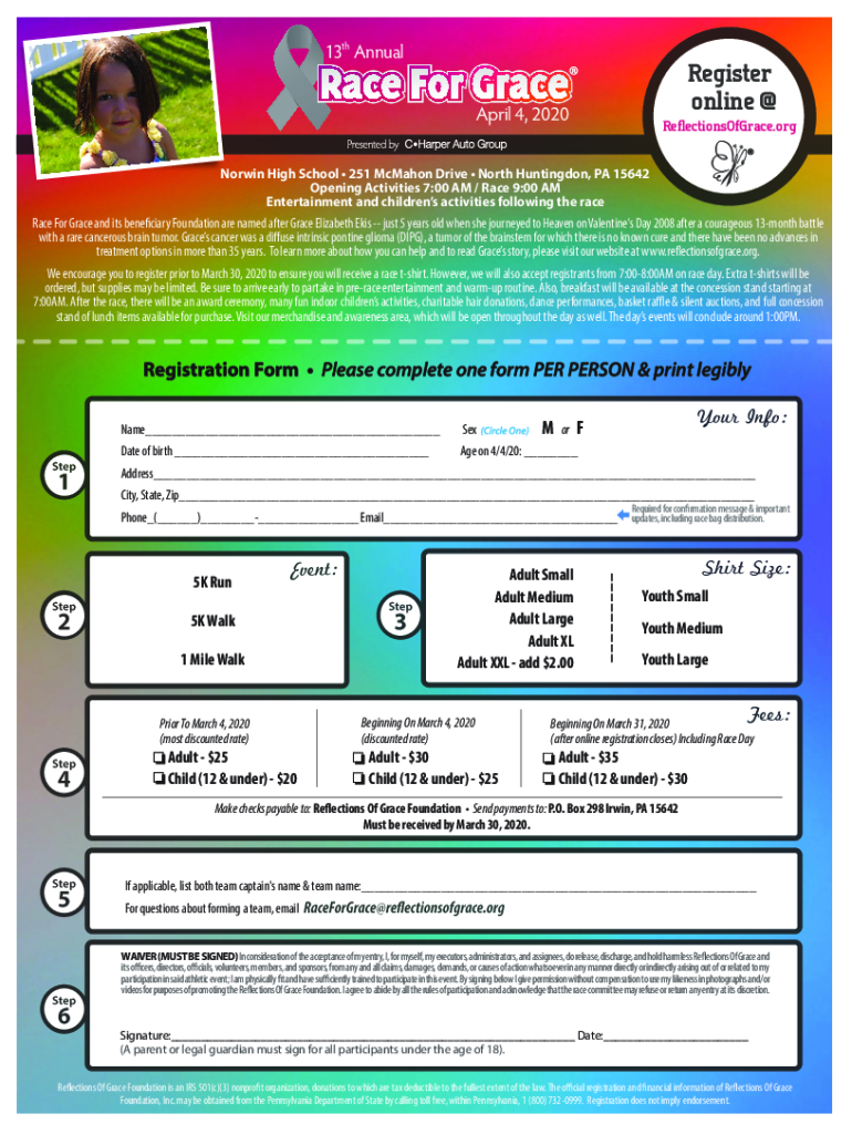 13th AnnualRegister online April 4, 2020ReflectionsOfGrace.orgNorwin High School 251 McMahon Drive North Huntington, PA 15642 Opening Activities 7:00 AM / Race 9:00 AM Entertainment and children's