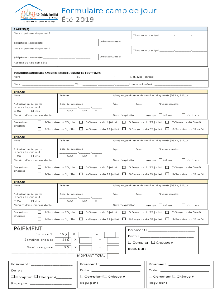 Formula ire camp DE four t 2019 PARENT(S) No met prom Du parent 1Tlphone principal Address courrielTlphone secondary No met prom Du parent 2Tlphone principal Address courrielTlphone secondary Address