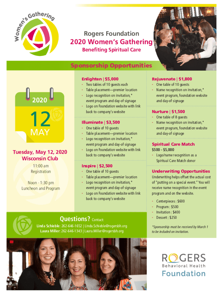 Rogers Foundation2020 Women's Gathering Benefiting Spiritual CareSponsorship Opportunities Enlighten $5,000 Two tables of 10 guests each Table placement premier location Logo recognition on invitation,