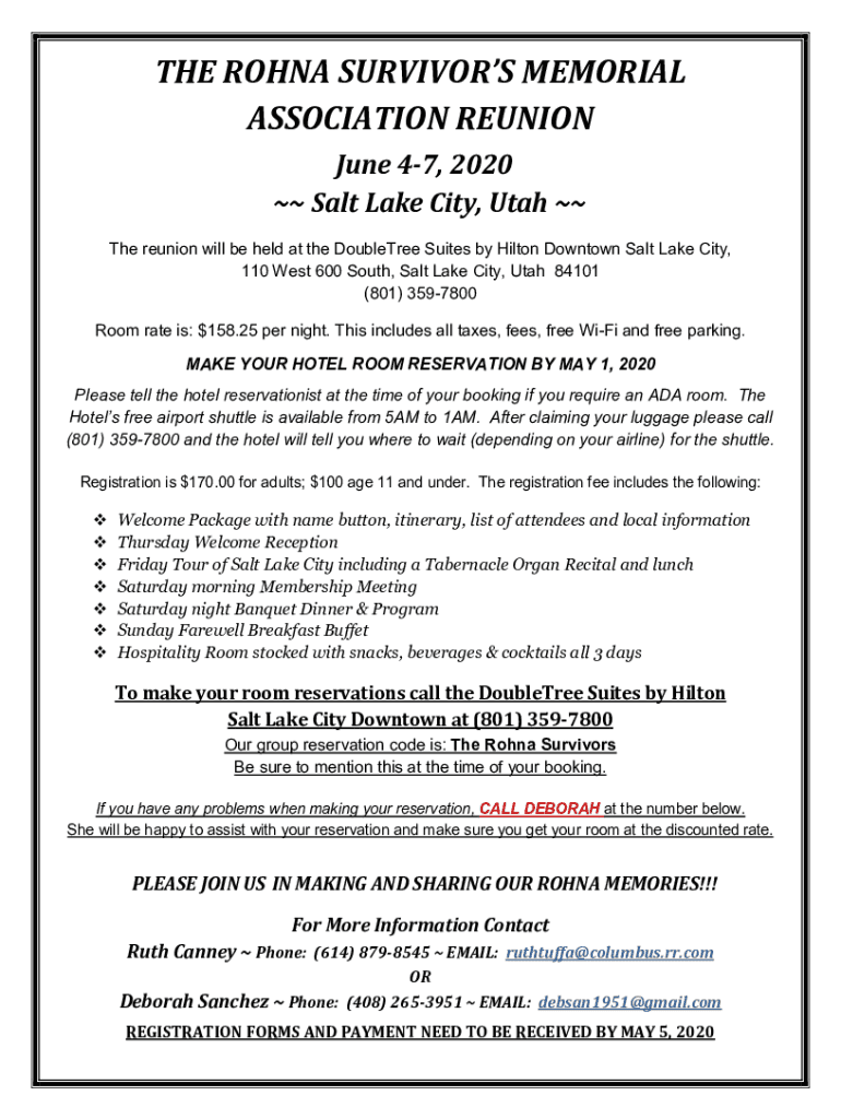 THE ROUND SURVIVORS MEMORIAL ASSOCIATION REUNION June 47, 2020 Salt Lake City, Utah The reunion will be held at the Doublet Suites by Hilton Downtown Salt Lake City, 110 West 600 South, Salt Lake