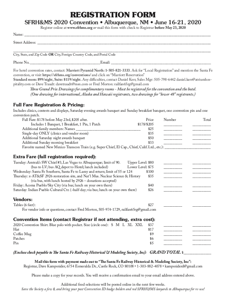 REGISTRATION FORMSFRH&MS 2020 Convention Albuquerque, NM June 1621, 2020 Register online at www.sfrhms.org or mail this form with check to Registrar before May 23, 2020Name: Street Address: City,