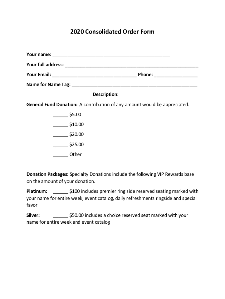 2020 Consolidated Order Form Your name: Your full address: Your Email: Phone: Name for Name Tag: Description: General Fund Donation: A contribution of any amount would be appreciated. $$$$5.0010.0020.0025.00
