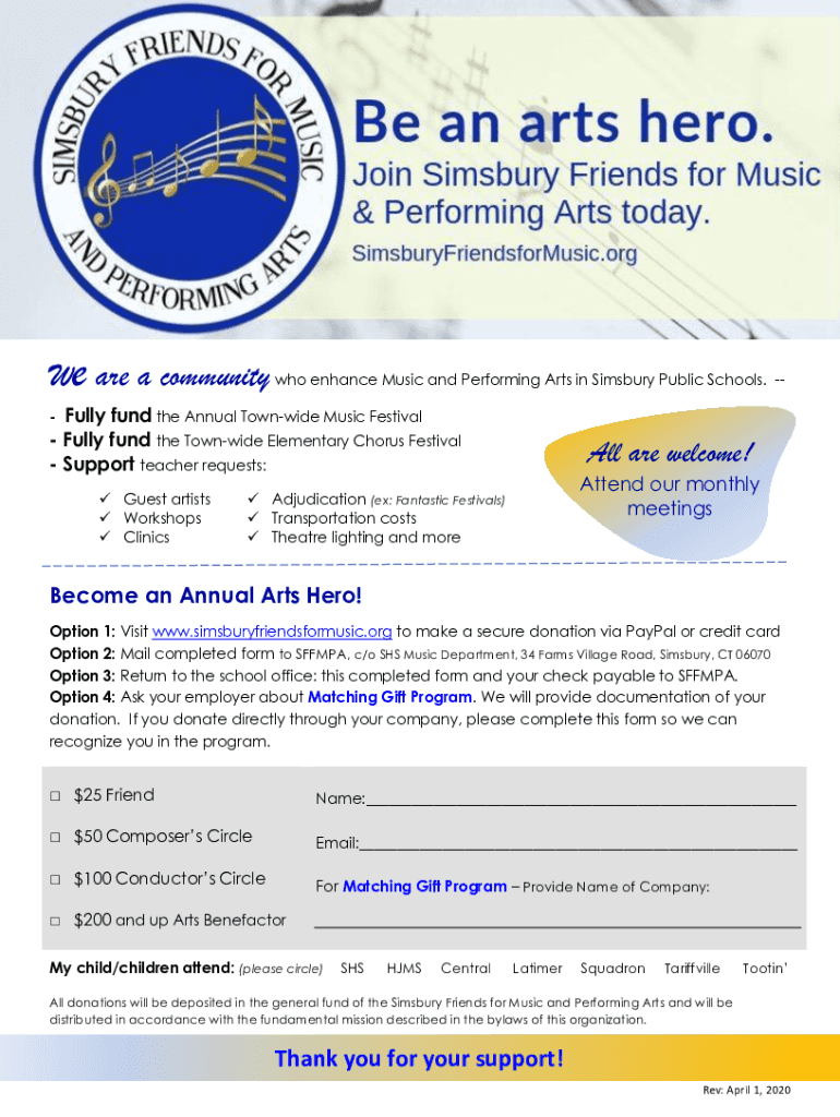 We are a community who enhance Music and Performing Arts in Sims bury Public Schools. Fully fund the Annual Town wide Music Festival Fully fund the Town wide Elementary Chorus Festival Support teacher