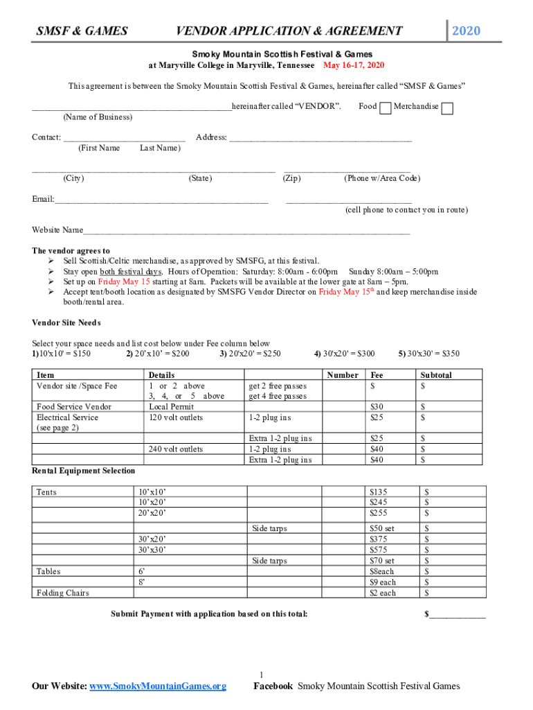 VENDOR APPLICATION & AGREEMENTS MSF & GAMES2020Smoky Mountain Scottish Festival & Games at Maryville College in Maryville, Tennessee May 1617, 2020 This agreement is between the Smoky Mountain Scottish