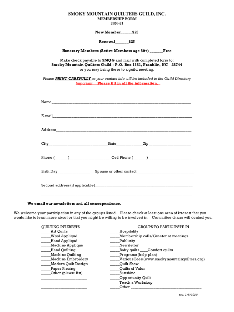 Get the free SMOKY MOUNTAIN QUILTERS GUILD, INC. MEMBERSHIP FORM 2019-2020