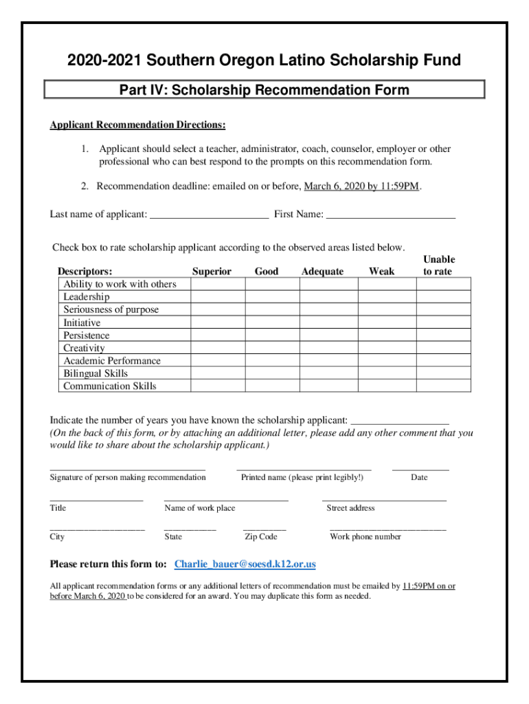 20202021 Southern Oregon Latino Scholarship Fund Part IV: Scholarship Recommendation Form Applicant Recommendation Directions: 1. Applicant should select a teacher, administrator, coach, counselor,