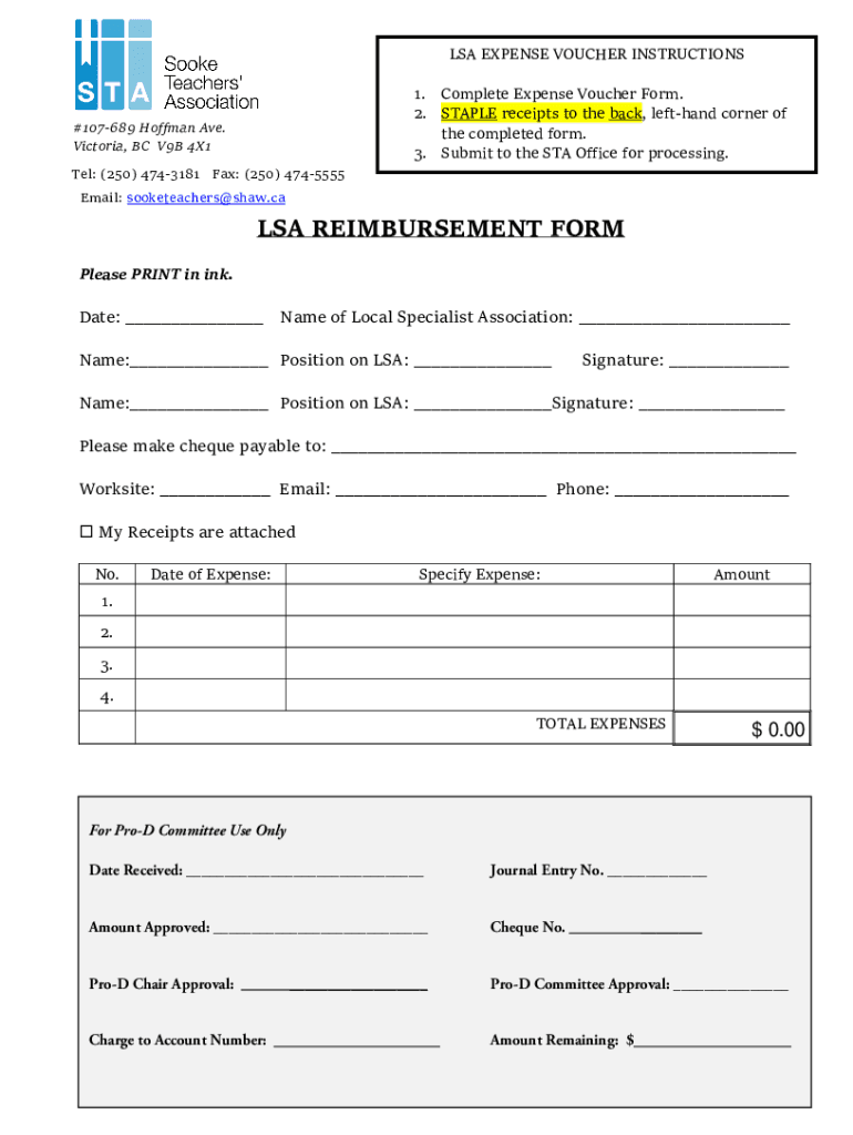 LSA EXPENSE VOUCHER INSTRUCTIONS#107689 Hoffman Ave. Victoria, BC V9B 4×1 Tel: (250) 4743181 Fax: (250) 47455551. Complete Expense Voucher Form. 2. STAPLE receipts to the back, left-hand corner of