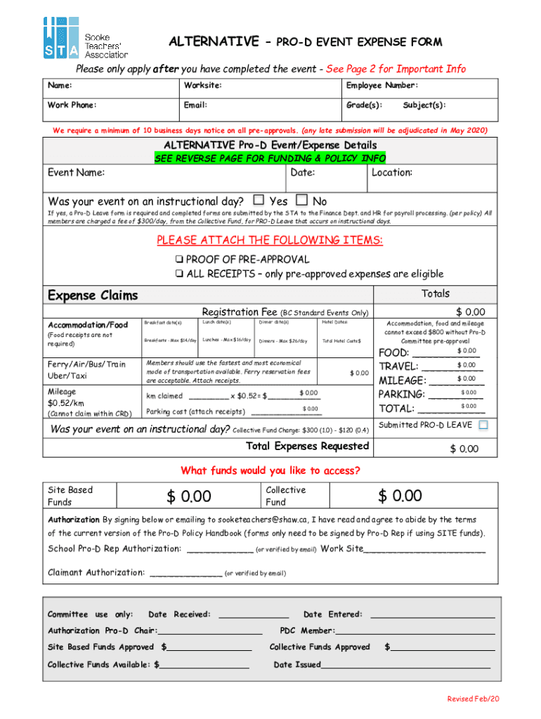 ALTERNATIVE PROD EVENT EXPENSE FORM Please only apply after you have completed the event See Page 2 for Important Info Name:Worksite:Employee Number:Work Phone:Email:Grade(s):Subject(s):We require