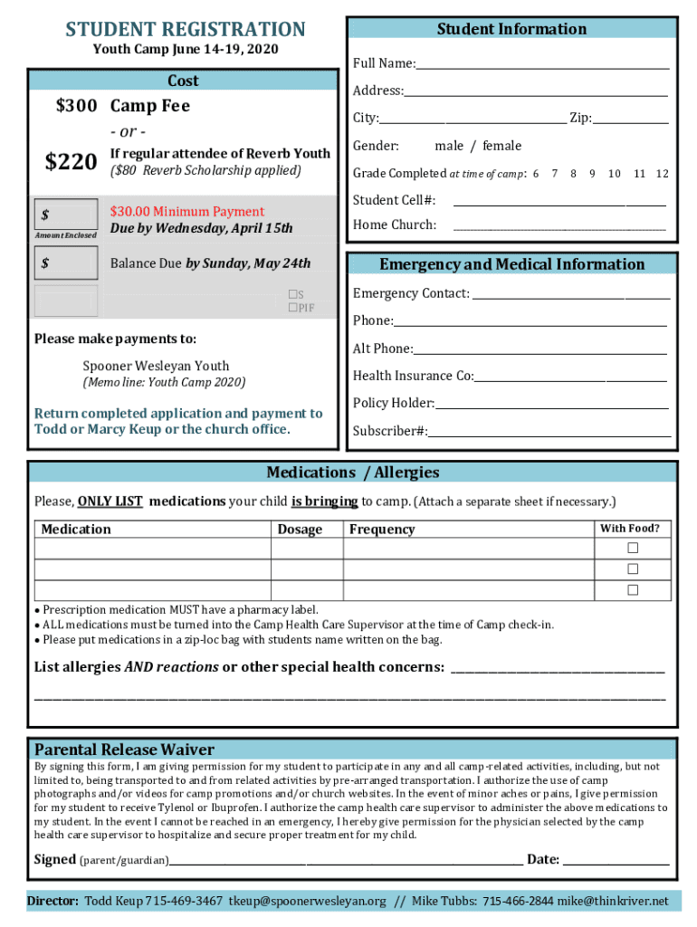 STUDENT REGISTRATIONStudent InformationCostFull Name: Youth Camp June 1419, 2020Address: $300 Camp Fee or $$220 Amount Enclosed regular attendee of Reverb Youth ($80 Reverb Scholarship applied) $30.00