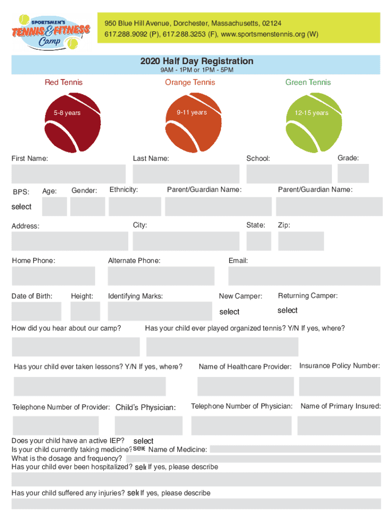950 Blue Hill Avenue, Dorchester, Massachusetts, 02124 617.288.9092 (P), 617.288.3253 (F), www.sportsmenstennis.org (W)2020 Half Day Registration 9AM 1PM or 1PM 5PMRed Tennis Orange Tennis911 years58