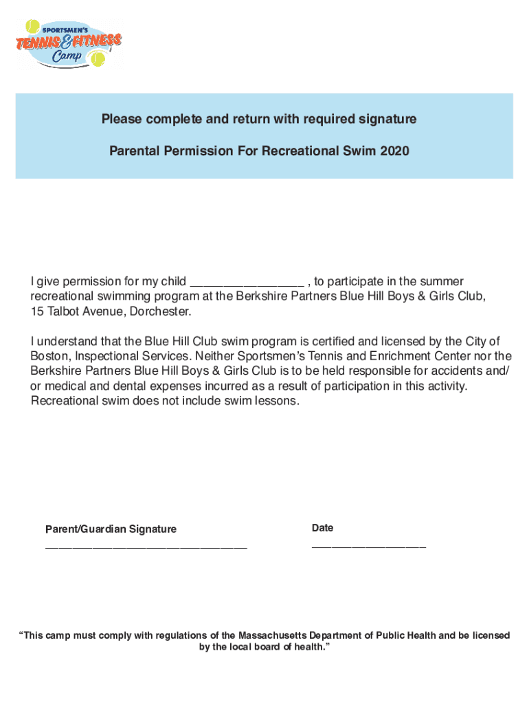 Please complete and return with required signature Parental Permission For Recreational Swim 2020I give permission for my child, to participate in the summer recreational swimming program at the Berkshire