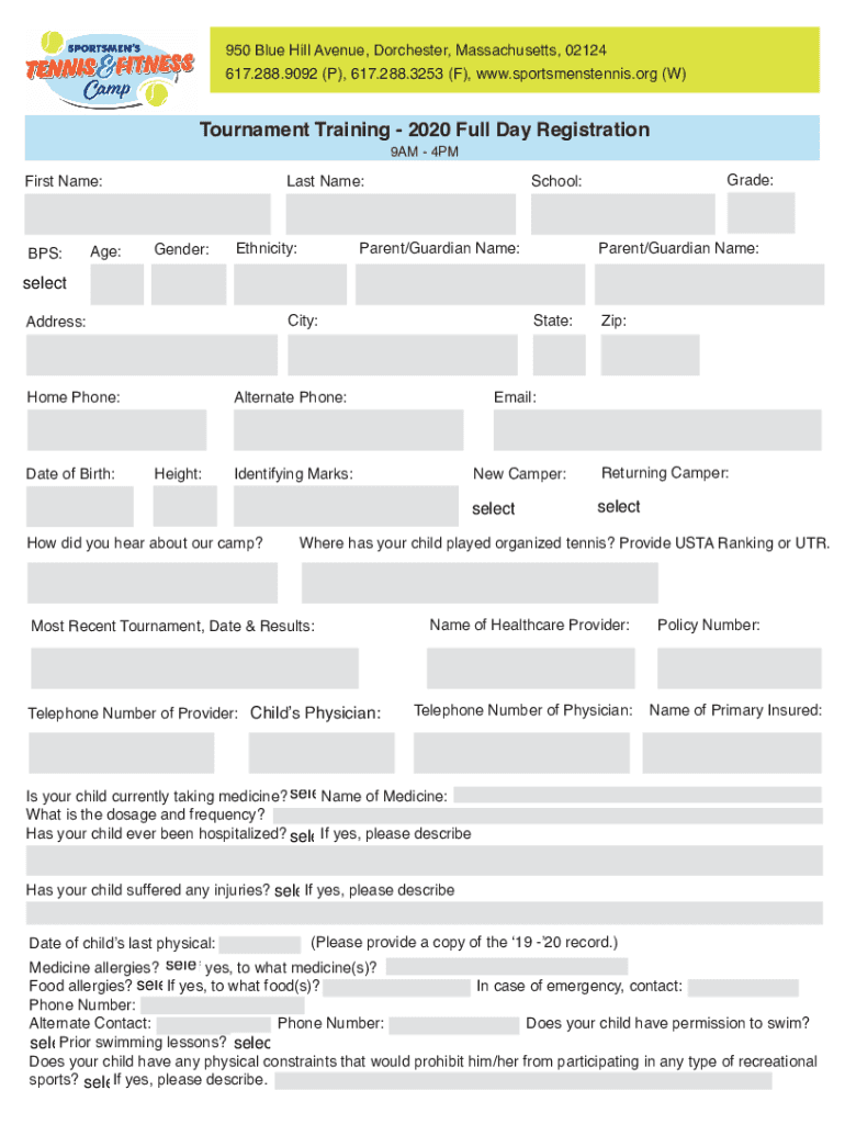 950 Blue Hill Avenue, Dorchester, Massachusetts, 02124 617.288.9092 (P), 617.288.3253 (F), www.sportsmenstennis.org (W)Tournament Training 2020 Full Day Registration 9AM 4PMFirst Name:BPS:Age:Last