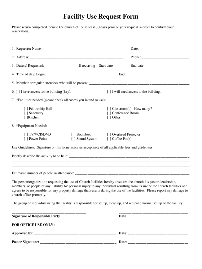 A facility use request form is a document that individuals or organizations must complete to request permission to use a specific facility for an event or activity.