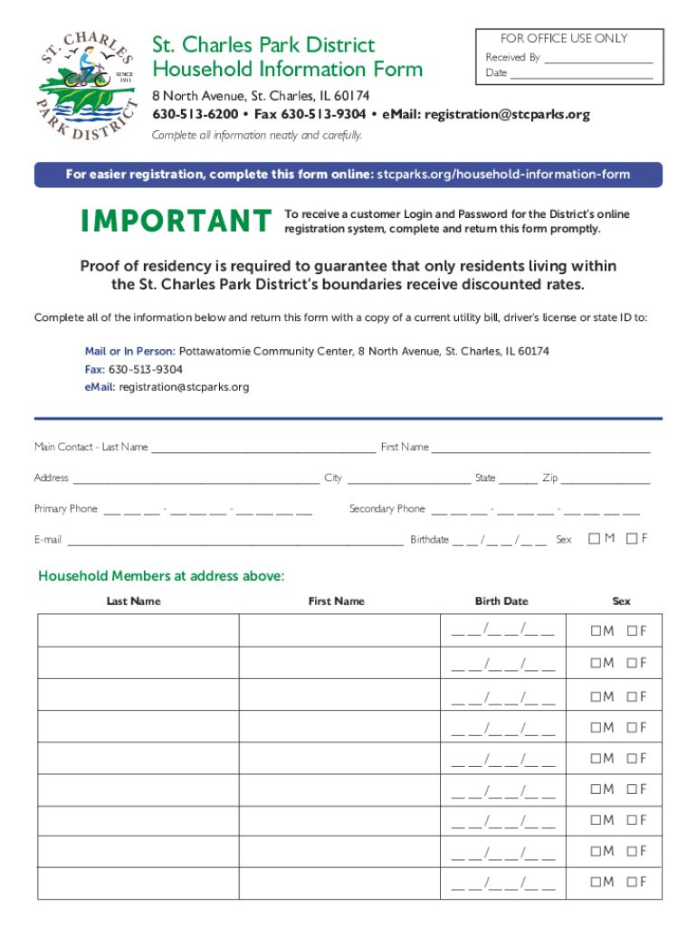 SHA R LES.CPA RKCTSINCE 1911DISTRISt. Charles Park District Household Information Former OFFICE USE ONLY Received By Date 8 North Avenue, St. Charles, IL 60174 6305136200 Fax 6305139304 email: registration