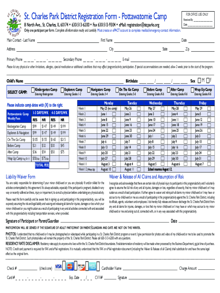 SHA R LES.CPA RKCTSINCE 1911DISTRISt. Charles Park District Registration Form Pottawatomie Camphor OFFICE USE ONLY Received By Date 8 North Ave., St. Charles, IL 60174 6305136200 Fax 6305139304 email: