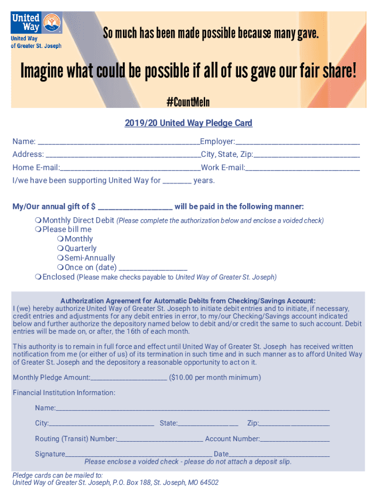 So much has been made possible because many gave. Imagine what could be possible if all of us gave our fair share! #Contain 2019/20 United Way Pledge Card Name: Employer: Address: City, State, Zip: