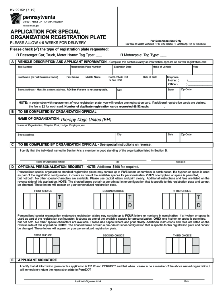 MV904SP (719)Application For Special Organization registration Plate www.dmv.pa.govPLEASE ALLOW 46 WEEKS FOR Delivery Department Use Only Bureau of Motor Vehicles PO Box 68266 Harrisburg, PA 171068266Please