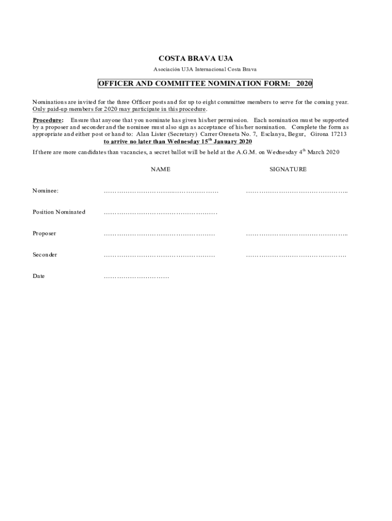 Association U3A International Costa BravaOFFICER AND COMMITTEE NOMINATION FORM: 2020
