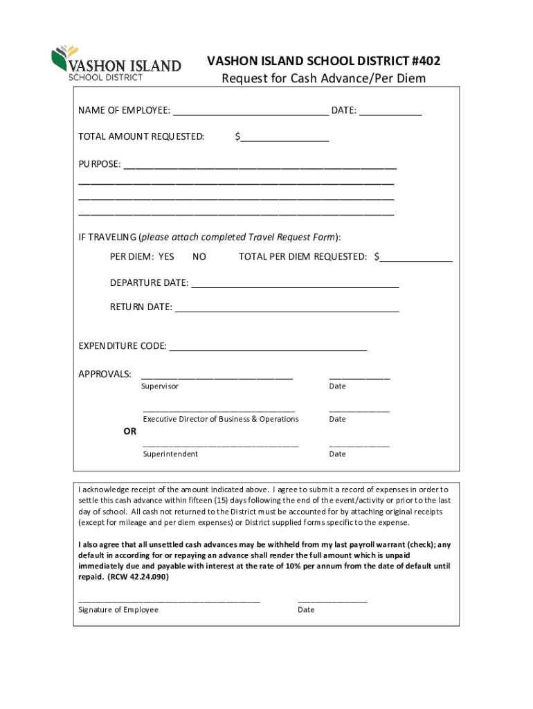 VASHONISLANDSCHOOLDISTRICT#402 RequestforCashAdvance/Per Diem NAMEOFEMPLOYEE: DATE: TOTALAMOUNTREQUESTED: $ PURPOSE: TRAVELING(pleaseattachcompletedTravelRequestForm): PERRIER:YESNOTOTALPERDIEMREQUESTED:$