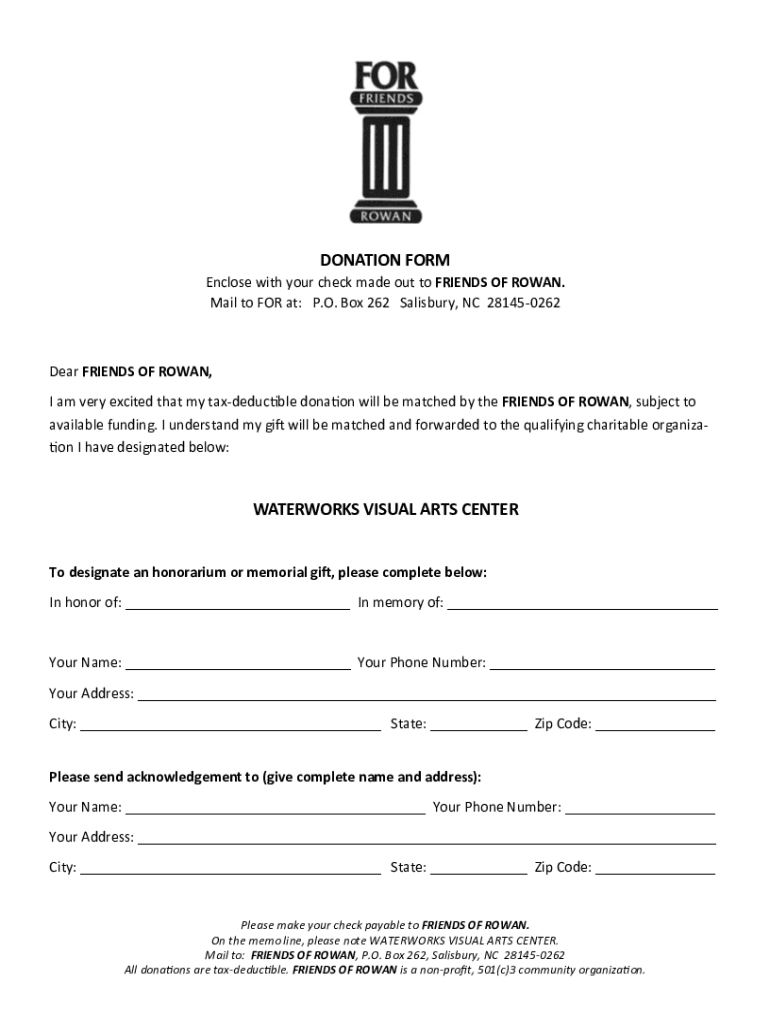 DONATION FORM Enclose with your check made out to FRIENDS OF ROWAN. Mail to FOR at: P.O. Box 262 Salisbury, NC 281450262Dear FRIENDS OF ROWAN, I am very excited that my tax-deductible donation will