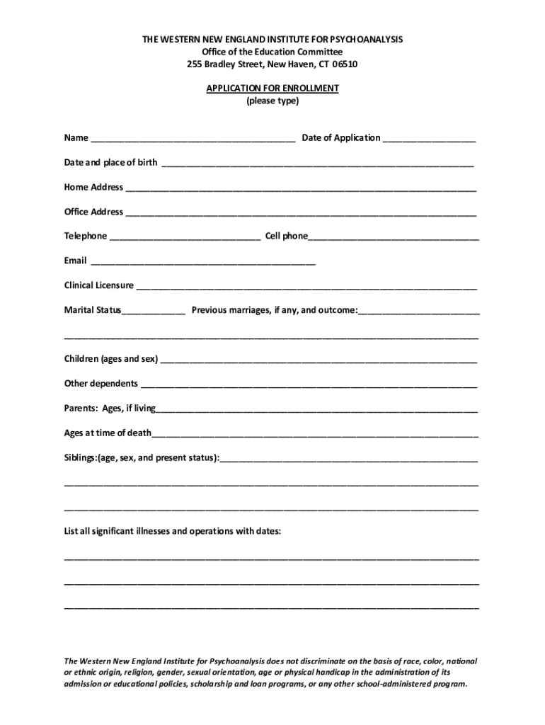 THE WESTERN NEW ENGLAND INSTITUTE FOR PSYCHOANALYSIS Office of the Education Committee 255 Bradley Street, New Haven, CT 06510 APPLICATION FOR ENROLLMENT (please type)Name Date of Application Date