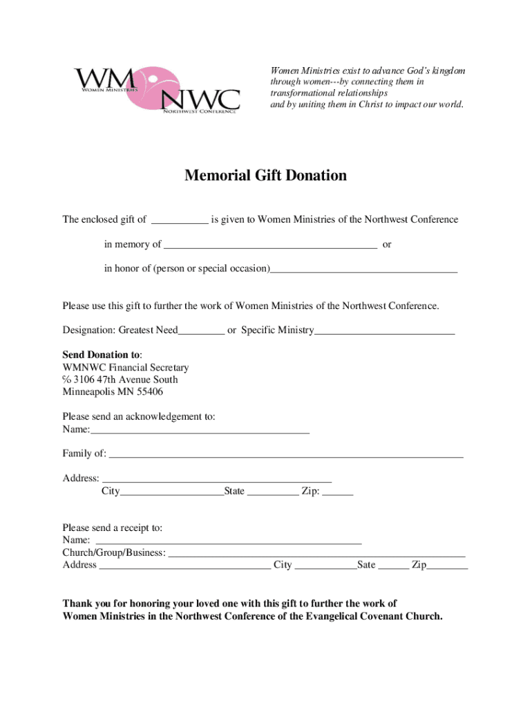 Women Ministries exist to advance Gods kingdom through women by connecting them in transformational relationships and by uniting them in Christ to impact our world. Memorial Gift Donation The enclosed