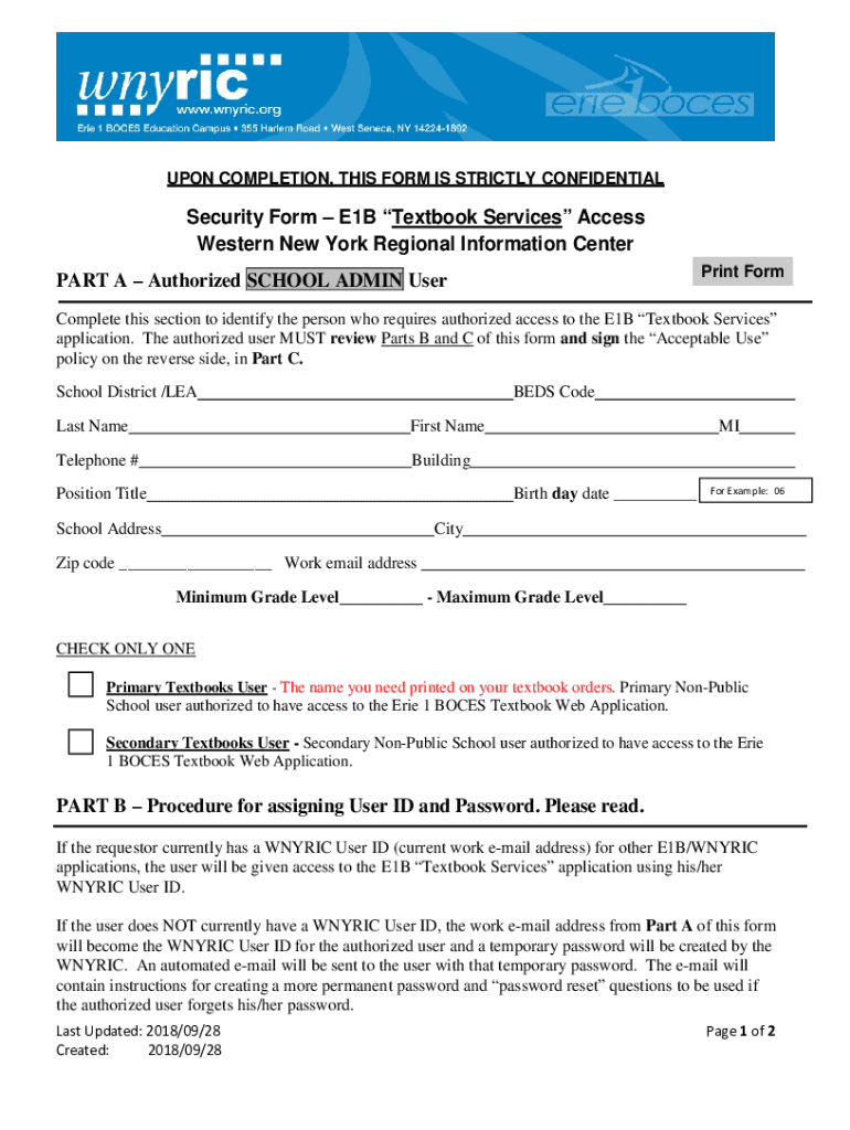 UPON COMPLETION, THIS FORM IS STRICTLY CONFIDENTIALSecurity Form E1B Textbook Services Access Western New York Regional Information Center Print Forepart A Authorized SCHOOL ADMIN UserComplete this