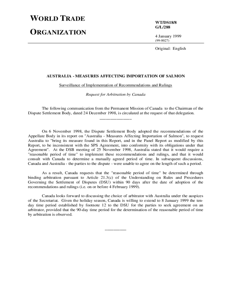 WORLD TRADE/DS18/8 G/L/288ORGANIZATION4 January 1999 (990027)Original: EnglishAUSTRALIA MEASURES AFFECTING IMPORTATION OF SALMON Surveillance of Implementation of Recommendations and Rulings Request
