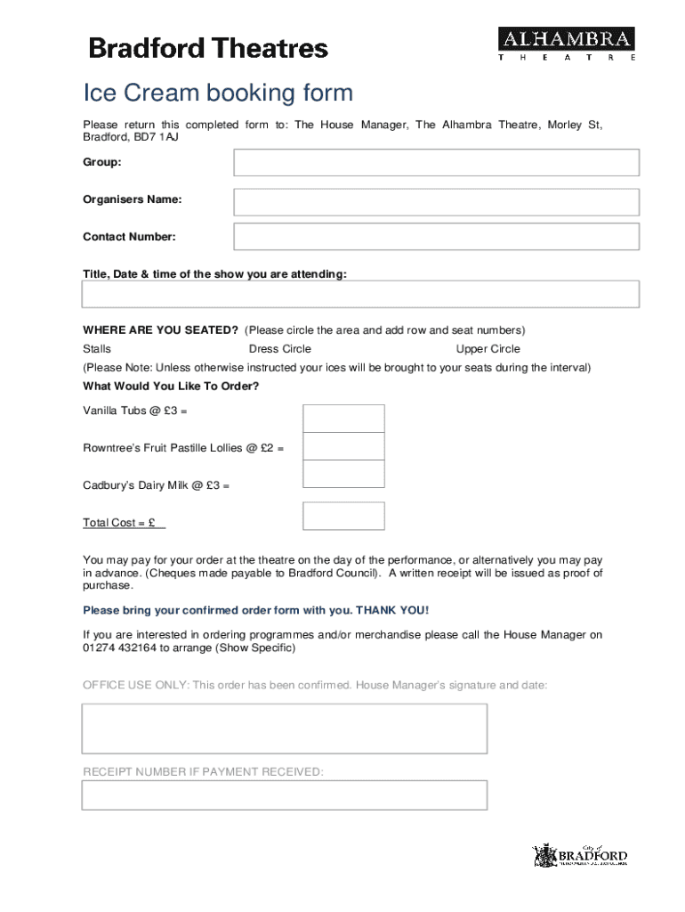 Ice Cream booking form Please return this completed form to: The House Manager, The Alhambra Theater, Morley St, Bradford, BD7 1AJ Group:Organizers Name:Contact Number:Title, Date & time of the show