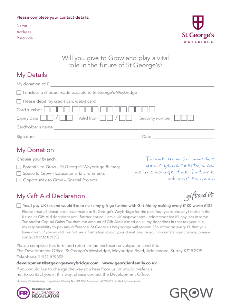 Please complete your contact details: Name Address Postcode Will you give to Grow and play a vital role in the future of St Georges? My Details My donation of I enclose a check made payable to St