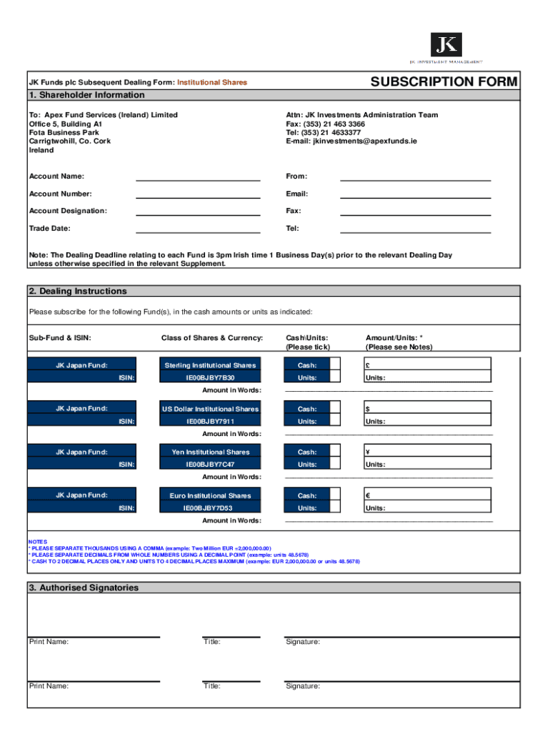SUBSCRIPTION FORM Funds plc Subsequent Dealing Form: Institutional Shares1. Shareholder Information