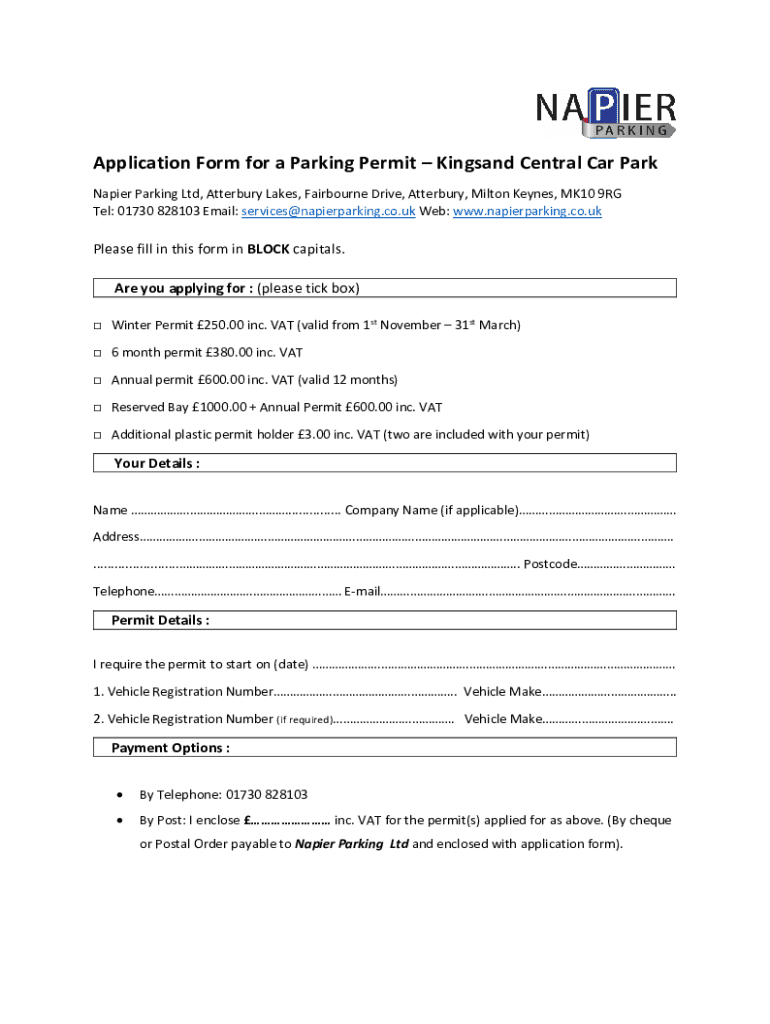 Application Form for a Parking Permit King sand Central Car Park Napier Parking Ltd, Canterbury Lakes, Airborne Drive, Canterbury, Milton Keynes, MK10 9RG Tel: 01730 828103 Email: services napierparking.co.UK