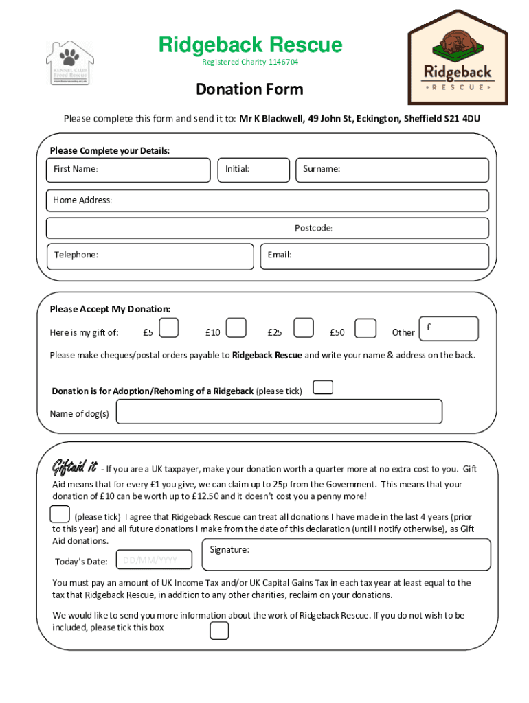 Ridge back Rescue Registered Charity 1146704Donation Form Please complete this form and send it to: Mr K Blackwell, 49 John St, Ellington, Sheffield S21 4DU Please Complete your Details: First Name:Initial:Surname:Home