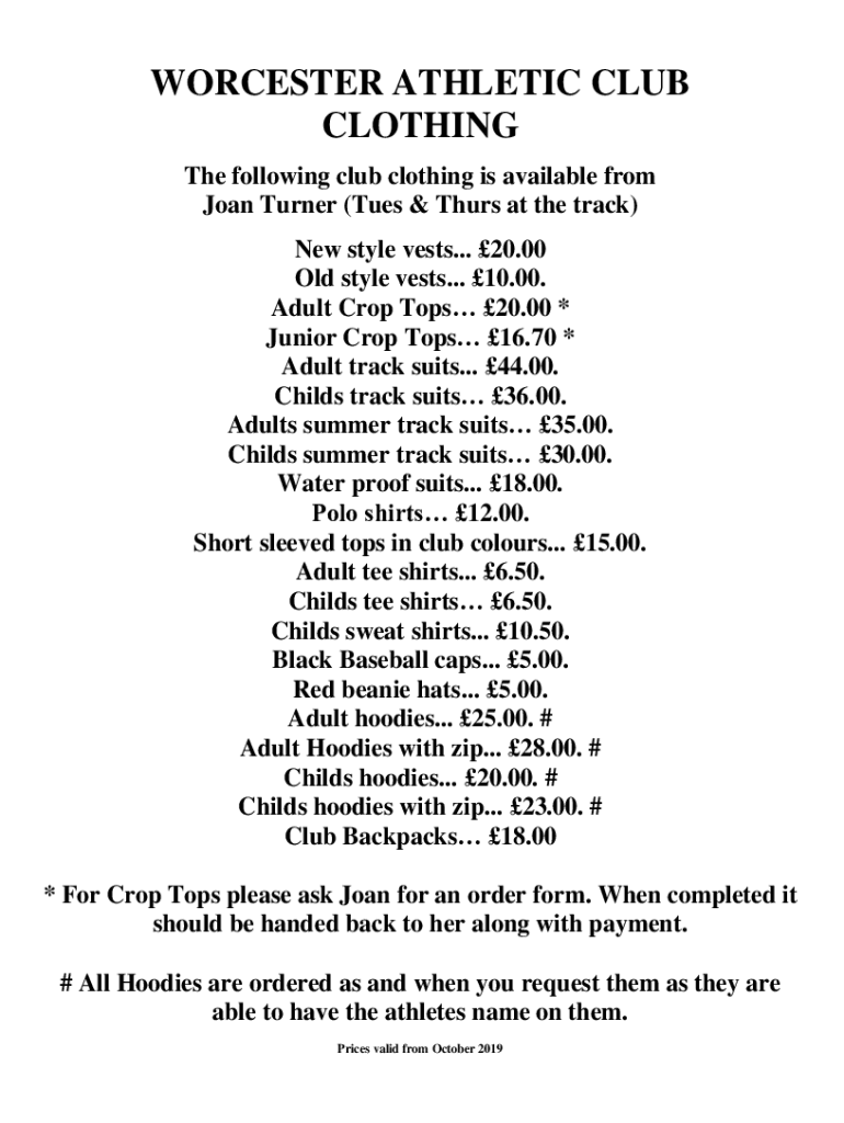 WORCESTER ATHLETIC CLUB CLOTHING The following club clothing is available from Joan Turner (Tues & Thurs at the track) New style vests... 20.00 Old style vests... 10.00. Adult Crop Tops 20.00 * Junior