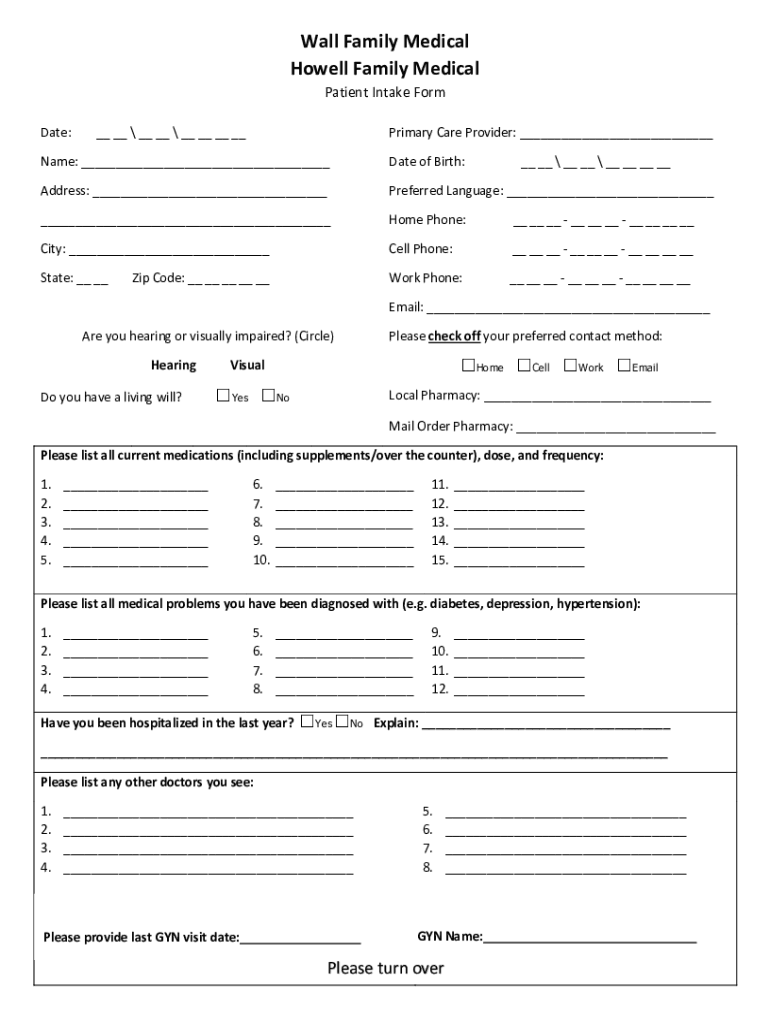 Wall Family Medical Howell Family Medical Patient Intake Format: Primary Care Provider: Name: Date of Birth:Address: Preferred Language: Home Phone: City: Cell Phone: State: Work Phone: Zip Code:
