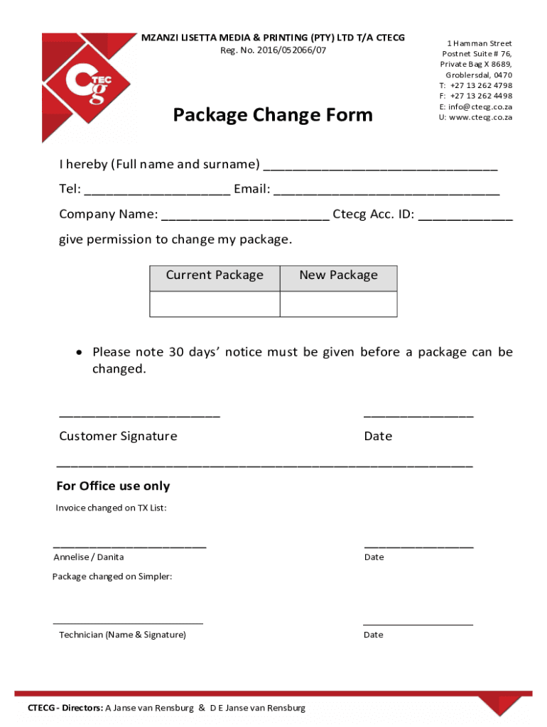 MANI LORETTA MEDIA & PRINTING (PTY) LTD T/A CT ECG Reg. No. 2016/052066/07Package Change Form1 Amman Street Postnet Suite # 76, Private Bag X 8689, Groblersdal, 0470 T: +27 13 262 4798 F: +27 13 262