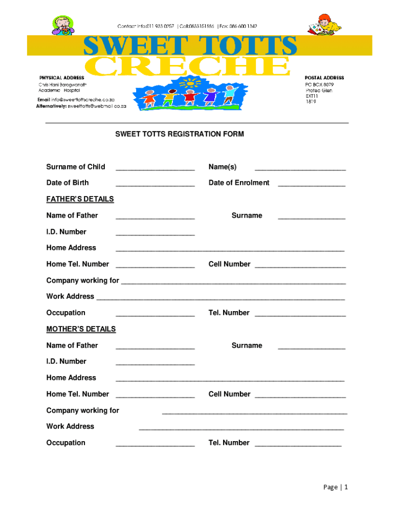 SWEET POTTS REGISTRATION FORMSurname of Child Name(s) Date of Birth Date of Enrollment FATHERS DETAILS Name of Father I.D. Number Home Address Home Tel. Number Surname Cell Number Company working
